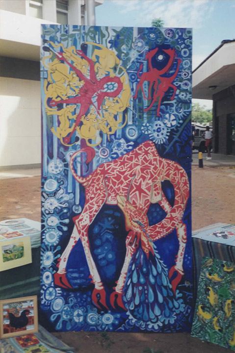 In Botswana, women make baskets each with a different motif derived from a poetic story. Here was my rendition of their ‘Tears of the Giraffe’ basket motif. I painted it after seeing a bull giraffe hanging forlornly around a fresh carcass of a female who had been killed by lions, back in 1993 in the Kalahari.